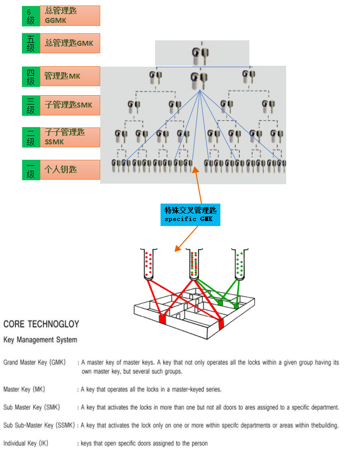 ● 总钥匙管理系统可提供6级管理并实现特殊的交叉管理 |
